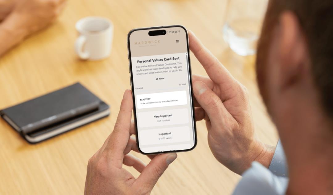 "Someone completing the Personal Values Card Sort on their phone"In a fast-paced and often chaotic world, the free Personal Values Card Sort helps people reconnect with what matters most. This simple 5-minute online exercise guides users to identify and prioritise their core values, offering a practical way to build clarity and steadiness. Based on principles from Acceptance and Commitment Therapy, it provides an accessible starting point for making more intentional, values-aligned decisions.