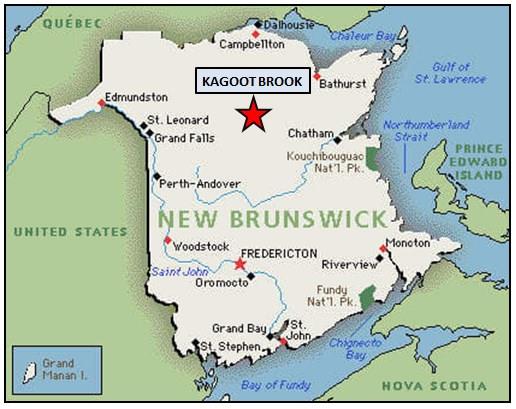 The Kagoot Brook Property consists of one mineral claim covering an area of approximately 767 hectares, covering reported historical cobalt stream and spring sediment / silt geochemical anomalies, with some samples reported from two streams (tributaries of Kagoot Brook) reported to be highly anomalous for cobalt. Such anomalies were reported by the New Brunswick Department of Natural Resources in the early 1980s along two northeast trending streams, one flowing from the southwest to north-central region of the Kagoot Brook property and the other stream within the eastern region of the property. Five samples from these streams were reported to return highly anomalous cobalt values in the 801 - 1316 ppm range (Davies, 1982).
