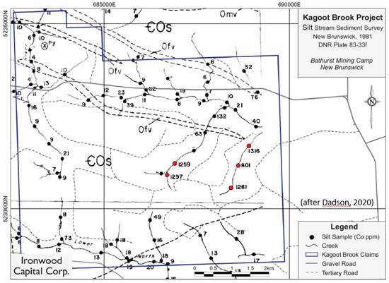 Highly anomalous cobalt stream silt anomalies were reported in the areas of these streams by Brunswick Mining and Smelting Corp. in the mid-1980s including multiple samples reported to exceed 1,000 ppm cobalt (Brown, 1985) and during 2018 by Explorex Resources Inc. including samples reported to exceed 1,000 ppm cobalt (up to 3,190 ppm cobalt) (Kemp, 2019).