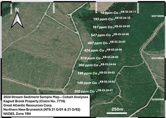 Great Atlantic has not identified the source of the cobalt stream sediment anomalies identified during the 2024 sampling. The Company is planning focused prospecting, rock - soil geochemical sampling and geophysical surveys in the area of the five central highly anomalous samples (360 - 610 ppm Co) and the area upstream of these samples. Great Atlantic is planning similar stream sediment sampling during 2026 for the second stream in the southwest to north-central regions of the property in areas of reported cobalt stream sediment / silt anomalies. Great Atlantic has not confirmed cobalt anomalies to date along this second stream.