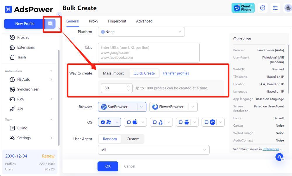 AdsPower's Bulk Create interface (shown above) lets teams import up to 1,000 browser profiles in one batch. This dramatically reduces setup time for large campaigns. By comparison, Multilogin's bulk operations are more cumbersome. AdsPower users can simply upload an Excel or TXT template to generate hundreds of profiles at once. Multilogin does offer“Bulk account creator” tools, but they focus on custom cloud-phone setups and still often require manual scripting or external API use. In short, AdsPower's 1000-profile import limit far exceeds what standard Multilogin bundles can do, and it comes ready-to-use without coding.