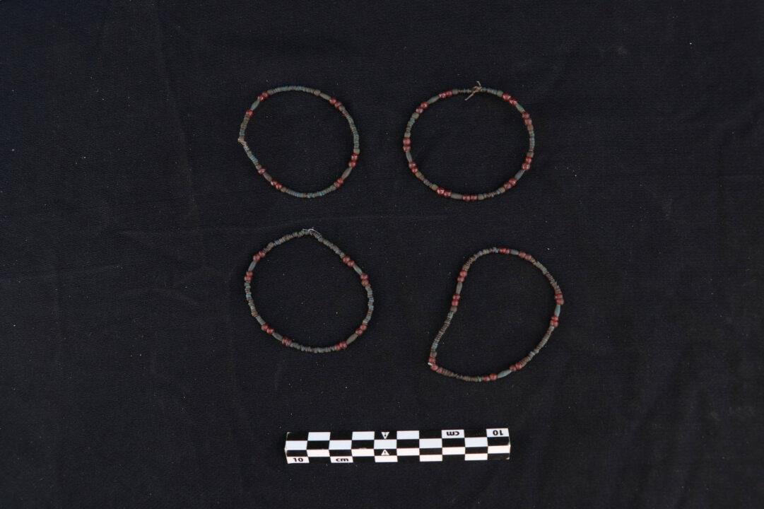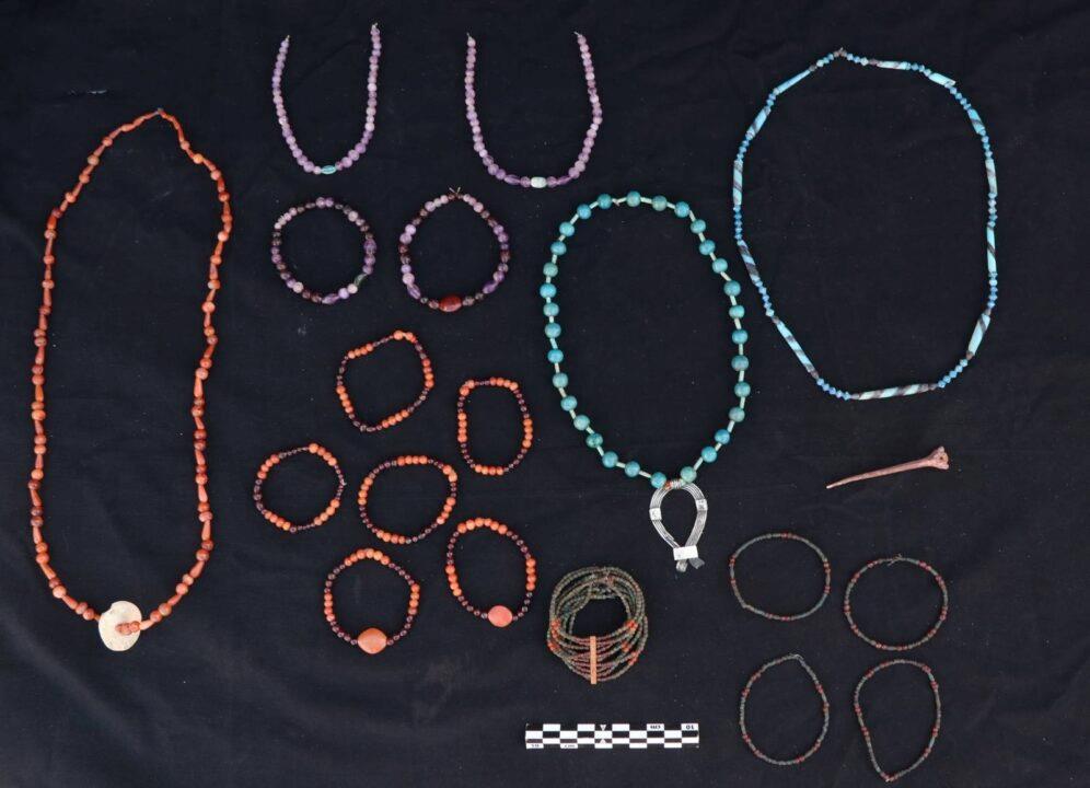 In the outer courtyard of the tombs, the team also discovered a collection of artefacts dating to the Middle Kingdom, including bronze mirrors, alabaster kohl containers, multicoloured bead necklaces, and a range of amulets.
