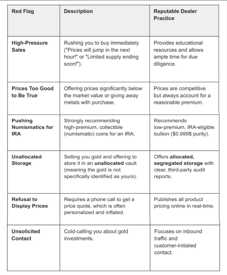 Irreversible Wire Transfers (to new, unverified dealers): Scammers often demand wire transfers because they are irreversible, leaving you no recourse if the gold is never shipped. Only wire funds to verified, long-standing, and highly-rated dealers.