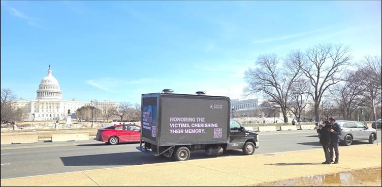 Organizers said the campaign sought to encourage the international community to honor the victims and support efforts toward accountability. Similar mobile billboard initiatives were held simultaneously in New York City and Boston.