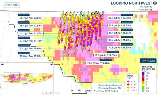 The results presented in this release include the final 907 m of drilling in 32 diamond drill holes (" DDH ") from the Keats excavation (" KEGCDP ") and the entirety of the 2,390 m of drilling in 40 DDH from the Iceberg excavation (" IEGCDP ") 2025 grade control drill program (Figures 1 to 4). The KEGCDP and IEGCDP were designed to improve confidence in the distribution of high-grade, near- to at-surface gold mineralization and support mine planning as outlined in the 2025 Preliminary Economic Assessment (" PEA ") Phase 1 open pits (see the New Found Gold press release dated July 21 2025 ). Drill highlights, along with detailed results for these 72 DDH, are provided in Tables 1 to 3 below.