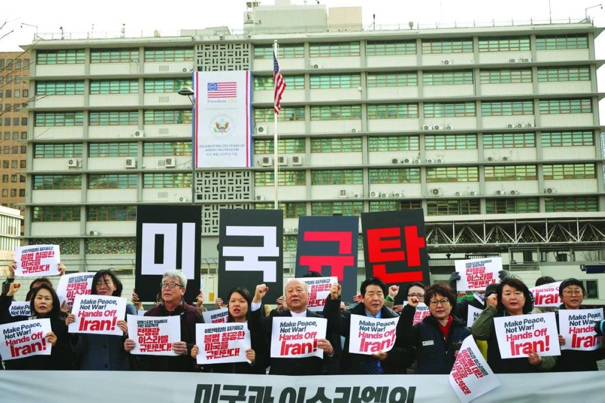 (MENAFN- Gulf Times) Activists chant slogans during a rally to condemn the joint US-Israel strikes on Iran, in front of US embassy in Seoul, South Korea, Sunday.slogans condemn US Israel strikes Iran