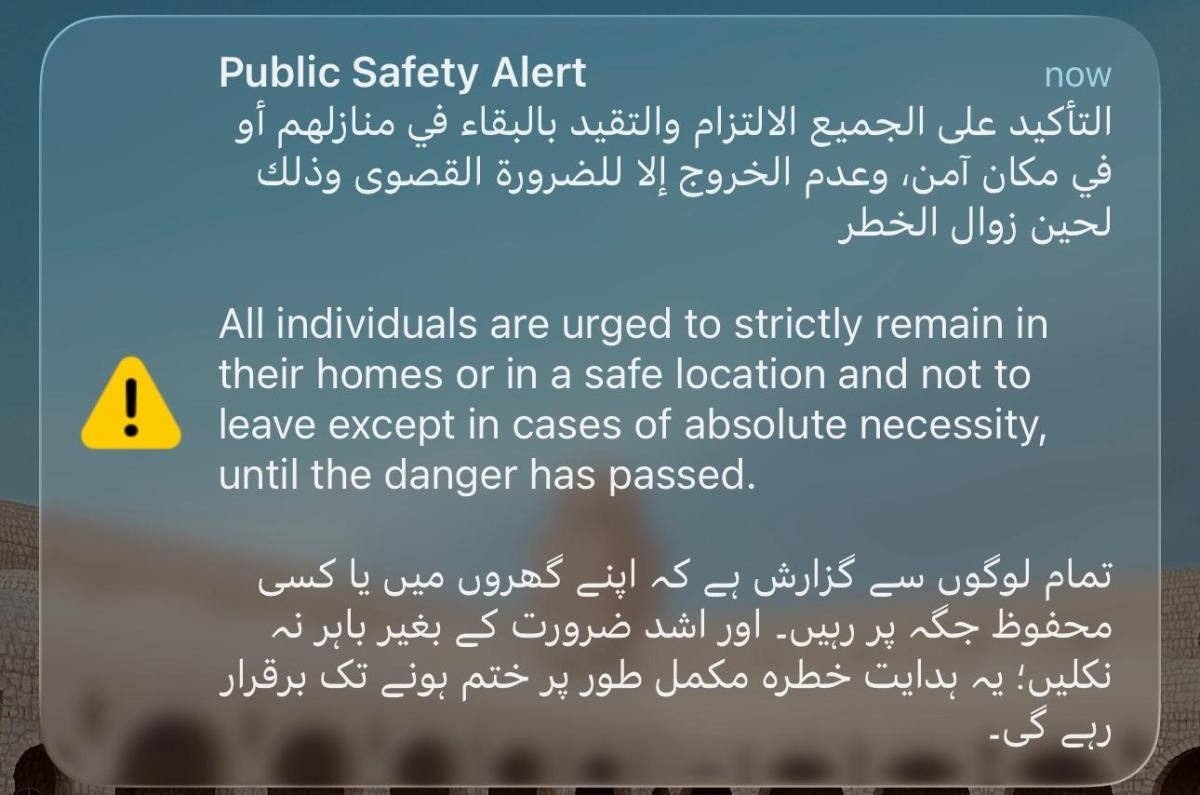 Doha, Qatar: Qatar sent out National Emergency Alert to all phone calling on public to stay indoors.