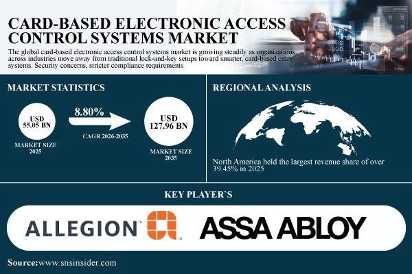 Austin, March 05, 2026 (GLOBE NEWSWIRE) -- The Card-Based Electronic Access Control Systems Market size was valued at USD 55.05 billion in 2025 and is expected to reach USD 127.96 billion by 2035, growing at a CAGR of 8.80% over the forecast period of 2026–2035.