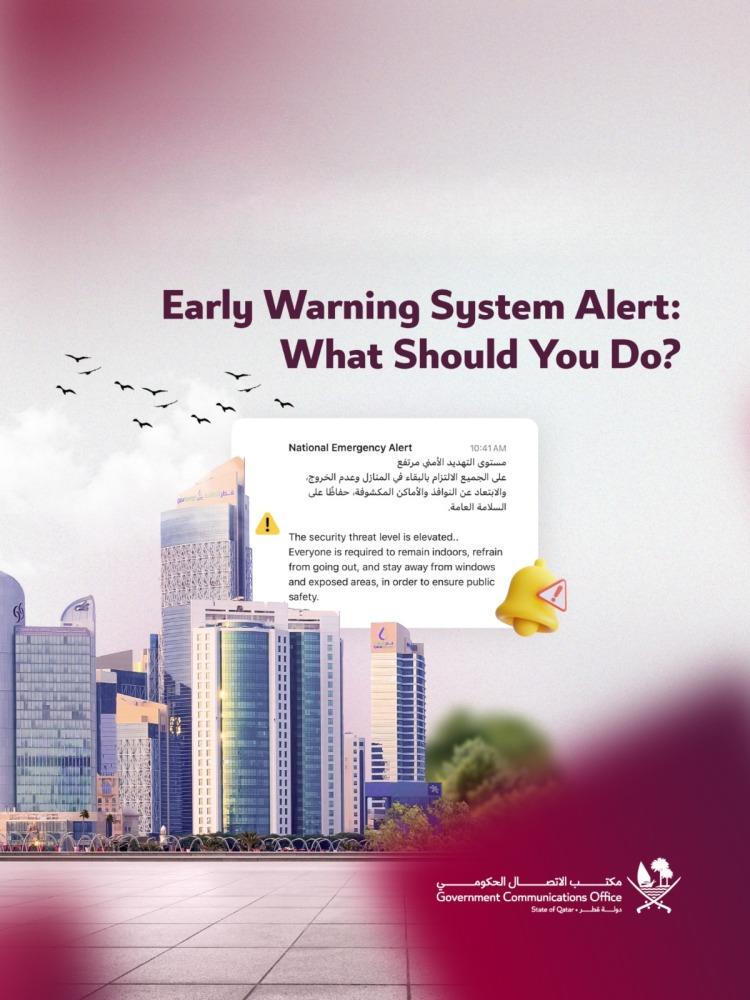 Doha, Qatar: Qatar's Government Communications Office (GCO) issued public guidance explaining how residents should respond if they receive an alert through the national early warning system, outlining safety procedures for different situations, including driving, being indoors, outdoors, or at the workplace.