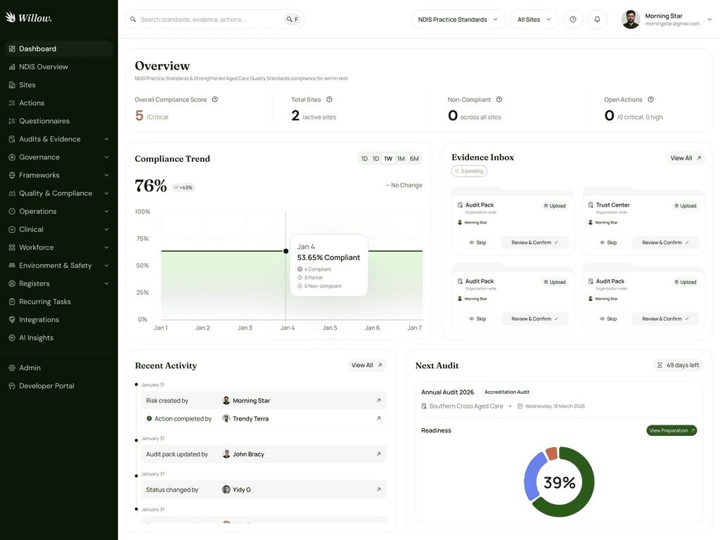 This matters because under the new standards environment, providers need more than a static audit folder. They need a system that can continuously show what evidence exists, what is missing, what has changed, what is overdue, where risk is emerging, and how each site is performing against the standards. Willow's dashboard is designed for exactly that, with compliance scores, cross-site visibility, action velocity, gap detection, audit countdowns and AI-driven risk insights.