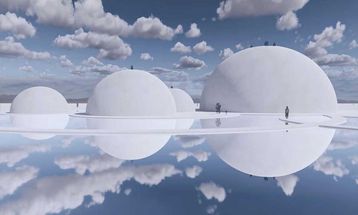The work comprises five semicircular structures built principally of salt, in varying sizes from roughly seven feet to 99 feet in diameter and reaching up to 50 feet high. Saraceno has described the forms as incomplete until the landscape itself finishes them: when water returns, the structures will appear whole in reflection,“when the water returns its hidden half.” Visitors will be able to climb stairs carved into the back of each structure to reach elevated viewing platforms.