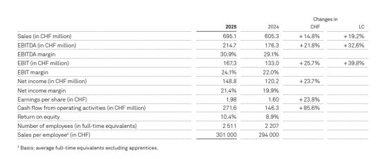 Group sales increase to CHF 695.1 million in 2025 (+14.8%, in local currencies +19.2%). EBITDA increases to CHF 214.7 million (+21.8%, in local currencies +32.6%). EBITDA margin lies at 30.9%. Adjusted for one-time effects of CHF 16.1 million, the EBITDA margin amounts to 28.6% and in local currencies 30.2%. Board of Directors proposes an increase in the dividend of CHF 0.05 to CHF 0.90 per share.
