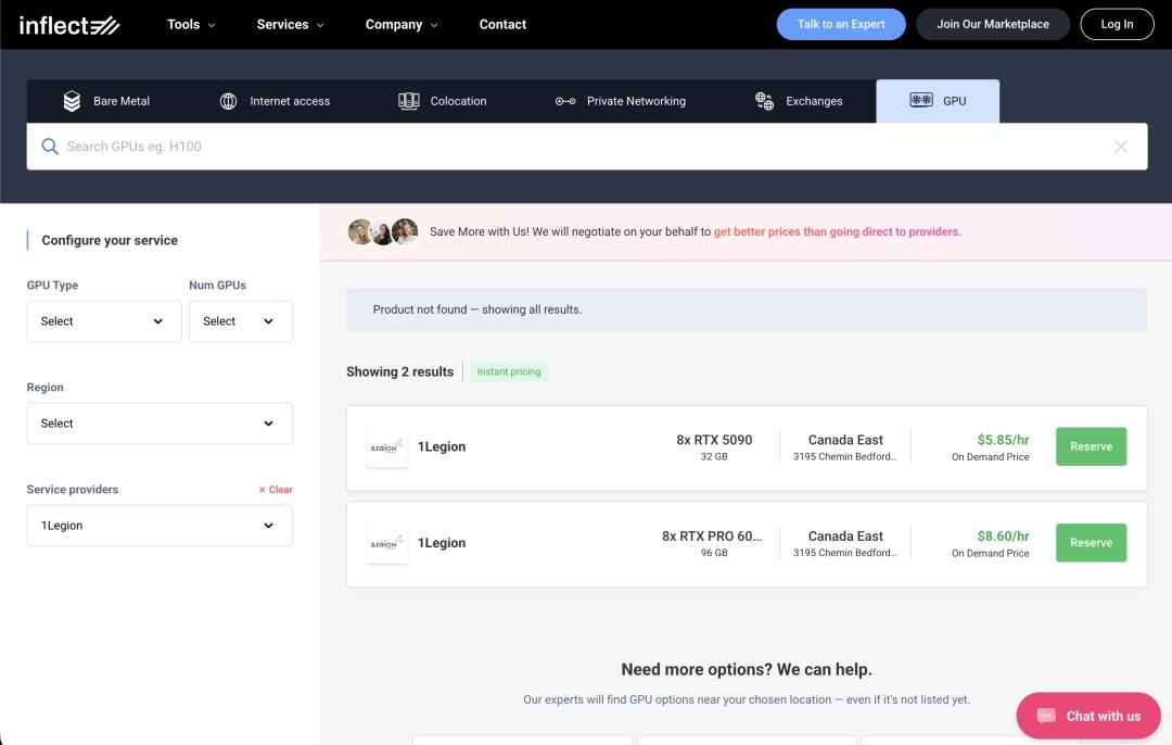 Companies interested in exploring available infrastructure can visit inflect/quote-tool/svr/all?provider=1Legion to browse 1Legion's services and deploy dedicated compute resources.