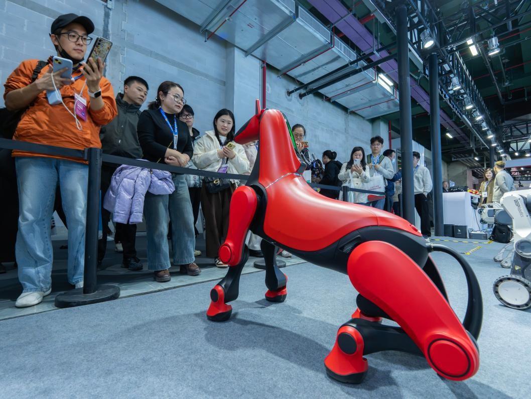 Stepping into the DEEP Robotics booth, the most eye-catching attraction was undoubtedly the vibrant Chinese-red Robot Horse Yunju. As a limited edition model launched for the Year of the Horse, Yunju became the instant visual focal point with its powerfully expressive biomimetic streamlined form. Numerous visitors paused to take photos, eagerly lining up to capture moments with this "Horse of the future." During the dynamic demonstration, Yunju showcased its stable walking and gait transition capabilities, maintaining smooth and effortless movement even while carrying a certain load, drawing continuous admiration from the crowd. This limited edition robot, specially crafted for the Year of the Horse, not only infused the booth with a festive horse-year atmosphere but also allowed visitors to experience the marvelous sensation of futuristic technology coming to life through casual interaction.