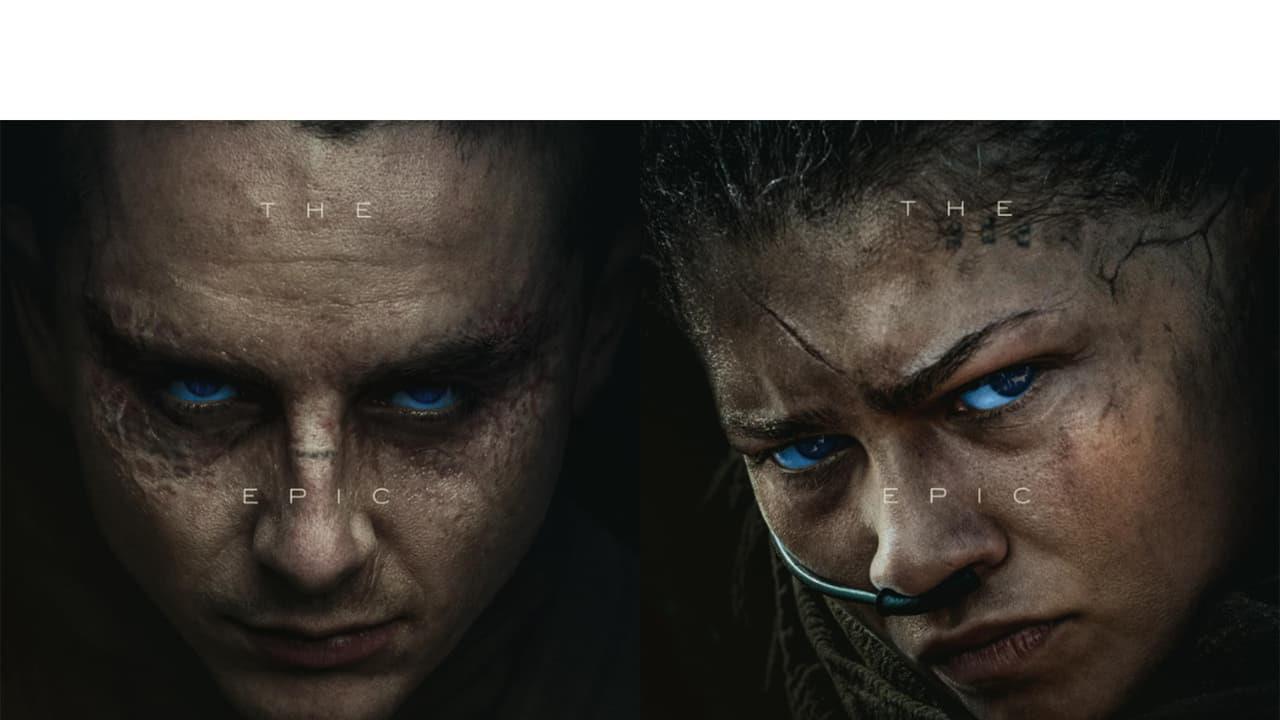 One of the posters shows Chalamet as Paul Atreides. The close-up image focuses on his eyes as he wears a Fremen stillsuit. His look in the new film appears slightly different, with wrinkles around his eyes and red scars on his face.