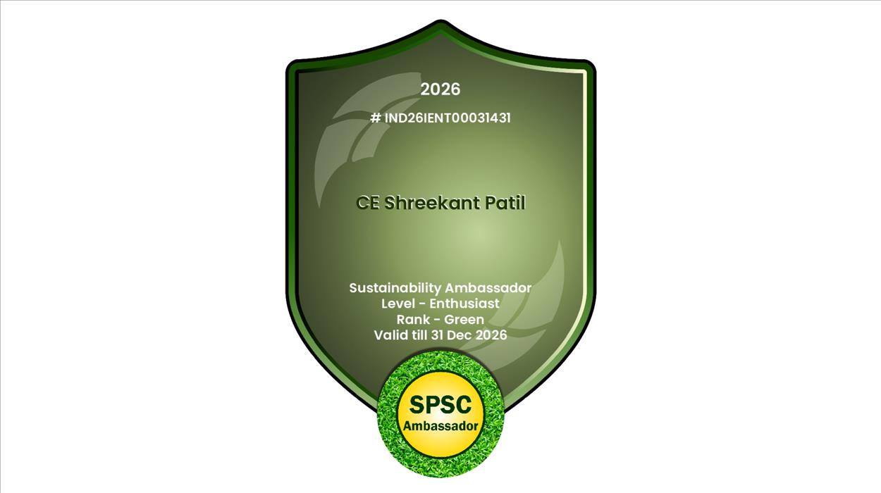 In recognition of his outstanding contributions to sustainability, CEng. Shreekant Patil has been awarded the distinguished Annual Appreciation – Sustainability Ambassador Level: Enthusiast, Rank: Green (No. IND26IENT00031431) by the United Nations SDGs through SPSC, UK.