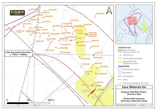 Historic exploration at the Congress Gold Mine was conducted during a period when gold market conditions were materially lower than today's environment, which directly influenced the selection criteria and cut-off grades used by previous operators. Consequently, the historic programs focused predominantly on higher-grade gold intersections, and many lower-grade vein intercepts that may be economically significant at current gold prices were not assigned the same level of analytical priority. Casa believes this creates a meaningful opportunity to reinterpret the mineralization system with a lower economic threshold, logically expanding the dimensions of the mineralization envelope that will be targeted in the forthcoming drilling season.