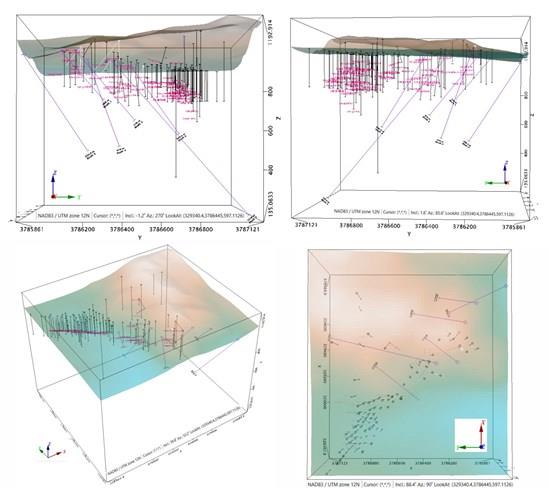 The 3D model was constructed using NAD83 / UTM Zone 12N coordinates and captures drill holes ranging from surface to depths approaching 600 metres below ground elevation. The model reveals that: