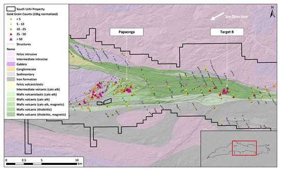 Figure 2. South Uchi Project normalised gold grain counts (till) - Target B location