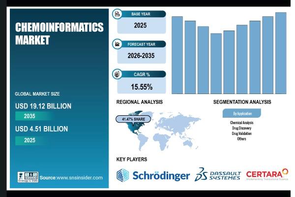 (MENAFN- GlobeNewsWire - Nasdaq) U.S. Chemoinformatics Market was valued at USD 1.87 billion in 2025 and is expected to reach USD 7.91 billion by 2035 due to the presence of the largest pharmaceutical R&D ecosystem globallyAustin, April 02, 2026 (GLOBE NEWSWIRE) -- According to SNS Insider, The Chemoinformatics Market size was valued at USD 4.51 billion in 2025 and is expected to reach USD 19.12 billion by 2035, growing at a CAGR of 15.55% over 2026-2035.