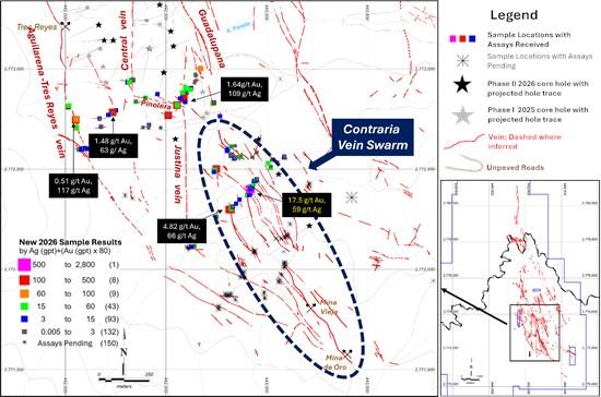 The 20,000 Phase II drill program is designed to continue extending zones of high-grade silver-gold mineralization at the Aguilareña vein; follow up on the recent high-grade discovery at the Justina vein (see news from February 9, 2026); and aggressively drill test the southern extension of the Aguilareña-Tres Reyes vein as well as the high-priority Justina vein, Contraria vein swarm, Pinolera, Mina Vieja and Mina de Oro areas.