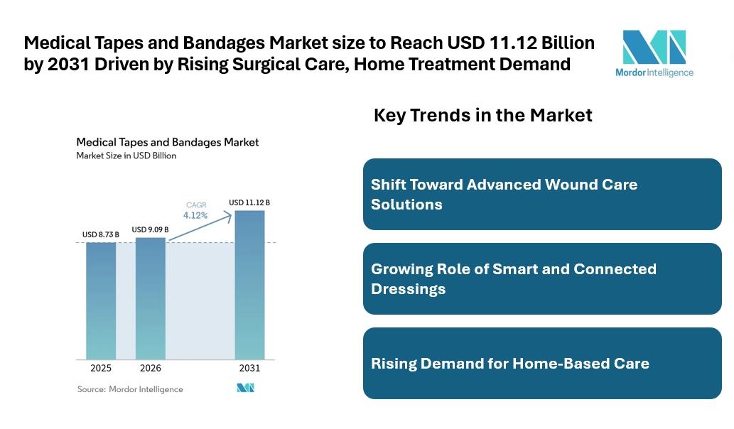 According to Mordor Intelligence, the medical tapes and bandages market size is estimated at USD 9.09 billion in 2026, growing from USD 8.73 billion in 2025 and projected to reach USD 11.12 billion by 2031, registering a CAGR of 4.12% during the forecast period. This steady market growth reflects the increasing need for wound care across hospitals, clinics, and home settings.