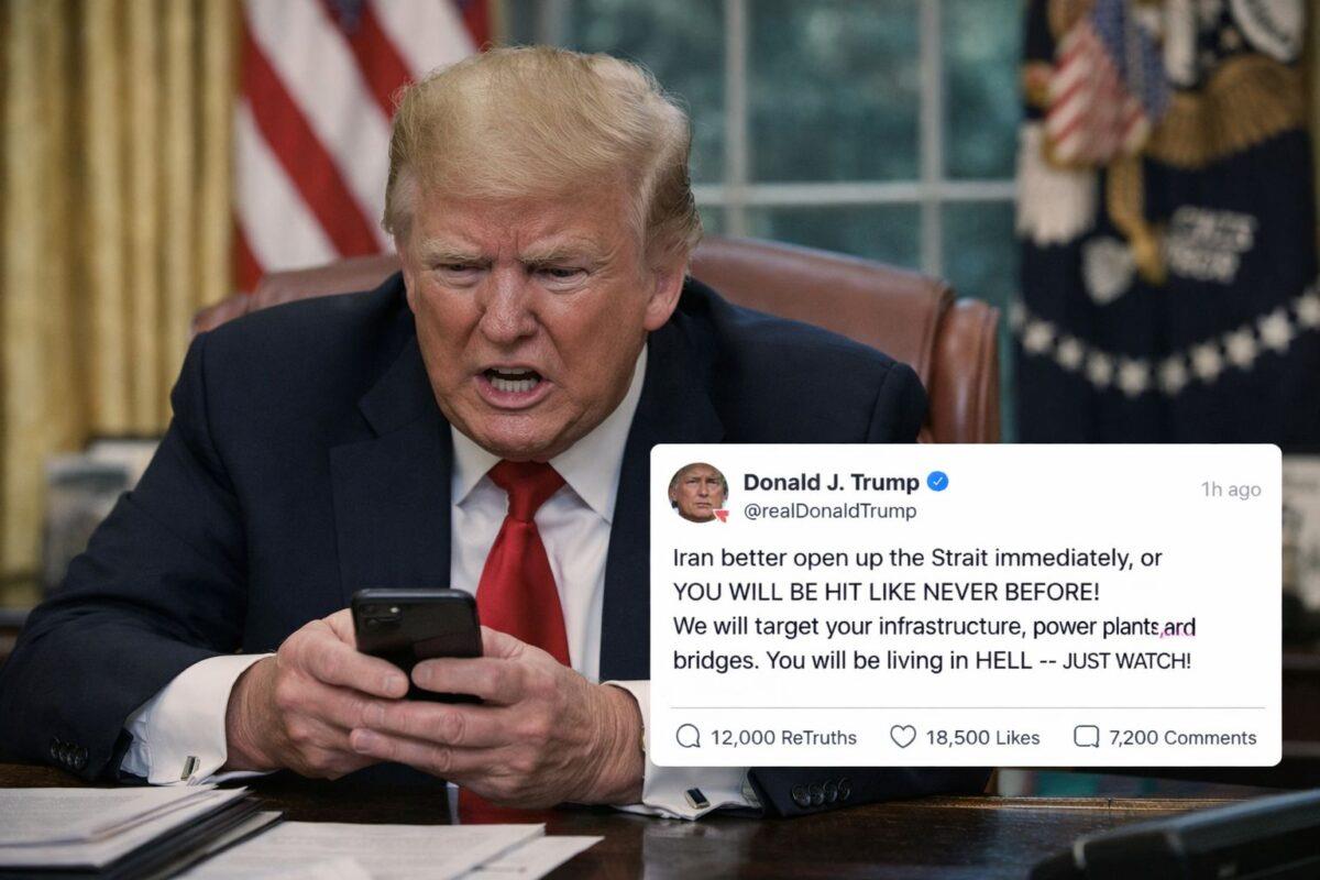 Trump threatened to destroy all of Iran's power plants and bridges if Tehran does not allow traffic to fully resume in the Strait of Hormuz in the Persian Gulf, through which a fifth of the world's oil transits in peacetime.