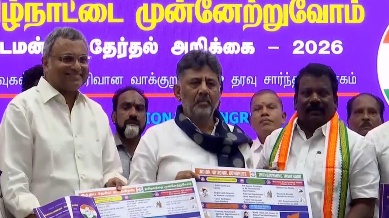 In the run-up to the Tamil Nadu Assembly elections on April 23, the Indian National Congress (INC) on Thursday released its manifesto aimed at "Transforming Tamil Nadu." Karnataka Deputy Chief Minister DK Shivakumar, Congress MP Karti Chidambaram, and State Congress chief K Selvaperunthagai were present during the unveiling.