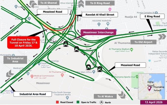 Doha, Qatar: The Public Works Authority, Ashghal, announced the closure of Mesaimeer Interchange Tunnel for traffic coming from Mesaieed Road towards Rawdat Al Khail Street.
