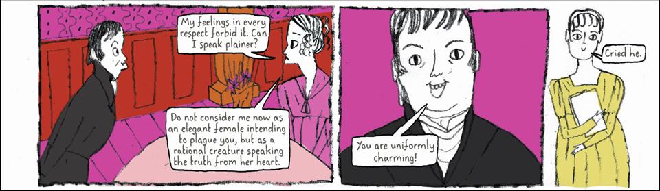 Like Evans, artist Isabel Greenberg uses a technique to contrast one aspect of Austen's creative practice with another. While Evans contrasts Austen's making patchwork fabrics with her writing, as two different but related creative pursuits, Greenberg uses different colour schemes to delineate ways that the author's imagination operated at different times.