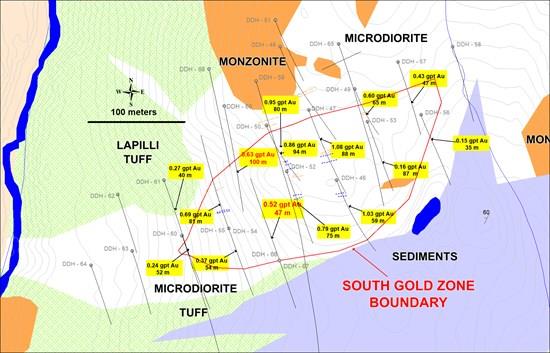 Please see the map below for drill hole locations and directions DDH 68 was located north of the Southern Gold Zone without reaching it at depth and Diamond Drill Hole 67 was collared to locate the southern boundary of gold mineralization which was intersected at about 20 metres with gold grades up to 0.299 gpt over 1.86 metres.