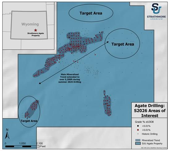 Kelowna, British Columbia--(Newsfile Corp. - April 14, 2026) - Strathmore Plus Uranium Corporation (CSE: SUU) (OTCQB: SUUFF) (" Strathmore " or " the Company ") is pleased to announce that exploration drilling at the Agate Project began on, Monday April 13th. The Agate Property is a potential in-situ recovery project located in the Shirley Basin Uranium District of central Wyoming. Agate borders both Cameco and UEC projects and lies close to UR-Energy's satellite in-situ mine that is currently under construction and planned for startup of operations this spring 2026.