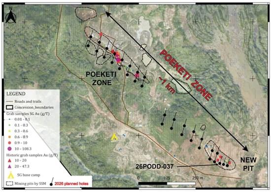 The Poeketi and Randy's Pit Zones, both hosting numerous artisanal pits and shallow underground mines extracting high-grade coarse gold, lie along the Poeketi Shear Zone ("PSZ"). Over the past months, artisanal miners have continued surface and underground mining along several pits in the Poeketi Zone. Drilling has commenced in the southeastern corner in an area referred to as the New Pit. These new workings establish a mineralized corridor for the Poeketi Zone of approximately 1 kilometre, which will be tested by the 5,000-metre drill program (see Figure 1).