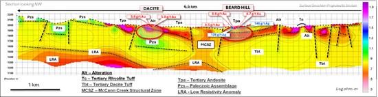 Recent integration of CSAMT data, historical mapping, and geological interpretation has significantly advanced the Company's understanding of the Dacite and Beard Hill targets. These targets, previously interpreted as near-surface expressions of mineralization, are now understood to be linked to a deeper, structurally controlled source. Interpretation of the dataset indicates that mineralization at both Dacite and Beard Hill is likely sourced from the McCann Creek Structural Zone, which is interpreted to represent a fluid conduit and feeder structure within the District.