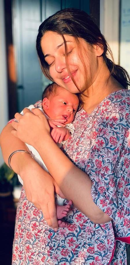 In the picture, Additi is seem holding her little one in her arms closely.