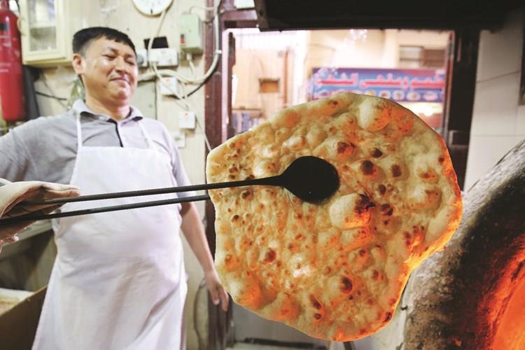 وتفوح في المكان رائحة الخبز المفضل لدى الكويتيين، بعد خروجه من الفرن التقليدي عند مدخل أحد مطاعم المباركية.