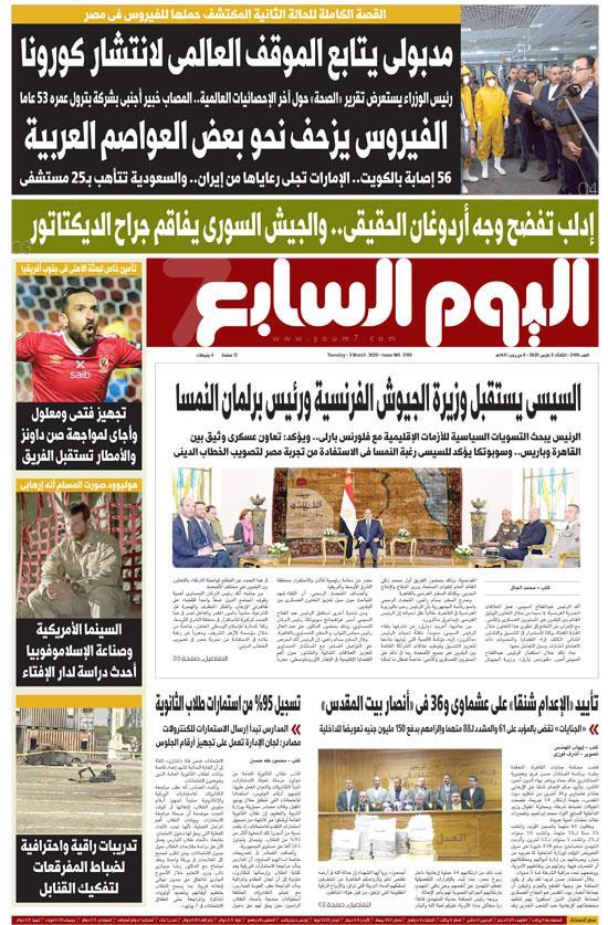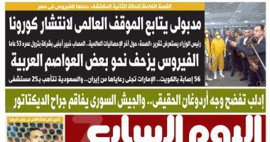 (MENAFN- Youm7) ينشر اليوم السابع في عدده الصادر غدا الثلاثاء، تفاصيل هامة حول العديد من الأحداث الجارية على الساحتين الداخلية والخارجية أبرزها ما جاء في الصفحة الأولى تحت عنوان، " القصة الكاملة للحالة الثانية المكتشف حملها للفيروس فى مصر"، وفيه: مدبولى يتابع الموقف العالمى لانتشار كورونا.. رئيس الوزراء يستعرض تقرير "الصحة حول آخر الإحصائيات العالمية.. المصاب خبير أجنبى بشركة بترول عمره 53 عاما.. الفيروس يزحف نحو بعض العواصم العربية.
