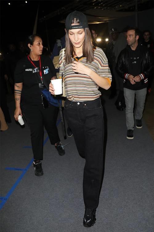 البلوزات المخططة كانت اتجاهًا شعبيًا فى التسعينيات، استخدمته بيلا حديد بأكثر من شكل وهو ما يؤكد عشقها لأساليب هذا العقد الأيقونى.