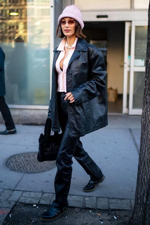 تعد السترات الجلدية الضخمة إحدى القطع المفضلة لـ بيلا حديد، وهى واحدة من أبرز اتجاهات التسعينيات، وقد ارتدتها بيلا مرارًا وتكرارًا.