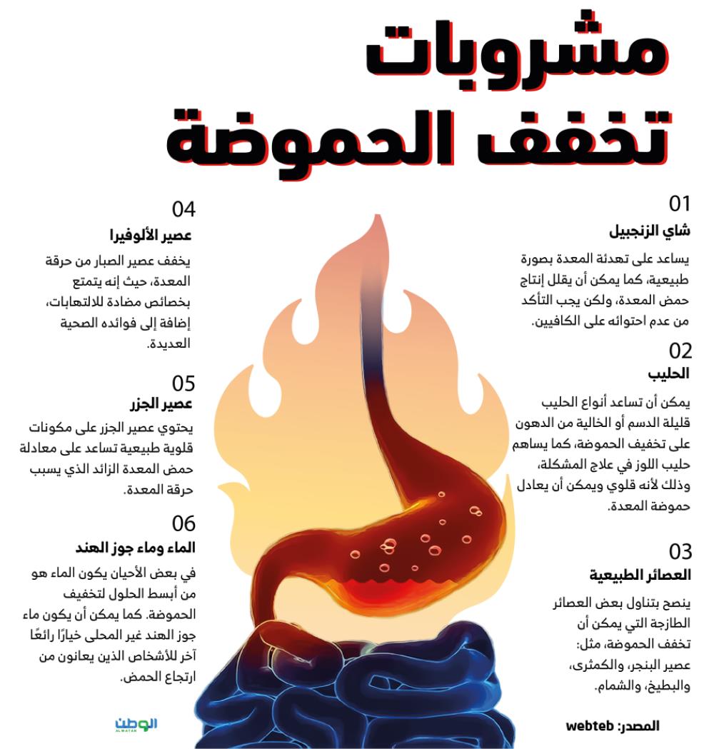 ينصح بتناول بعض العصائر الطازجة التي يمكن أن تخفف الحموضة، مثل: عصير البنجر، والكمثرى، والبطيخ، والشمام.