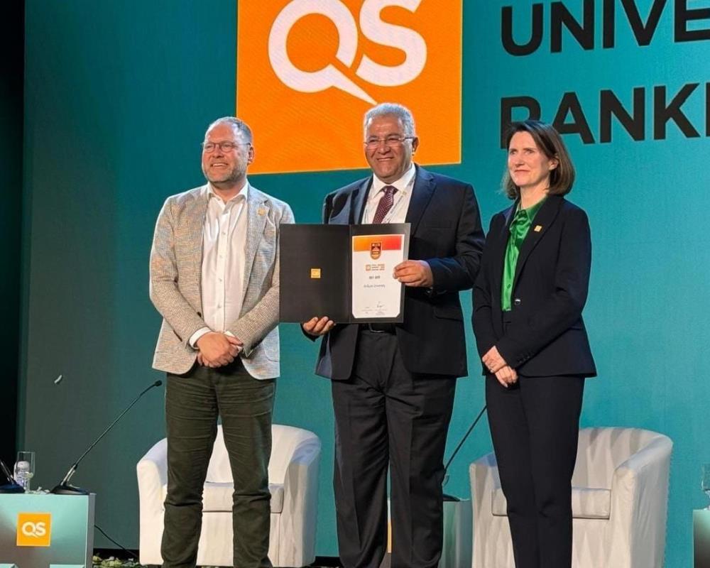 QS العالمي للعام 2025 ضمن فئة أفضل 851-900 جامعة حول العالم، كأول جامعة فلسطينية تدخل هذه الفئة، متقدمةً 180 موقعاً في التصنيف العالمي للعام 2025، بمعدل تقدم 10.2% عالميًا.