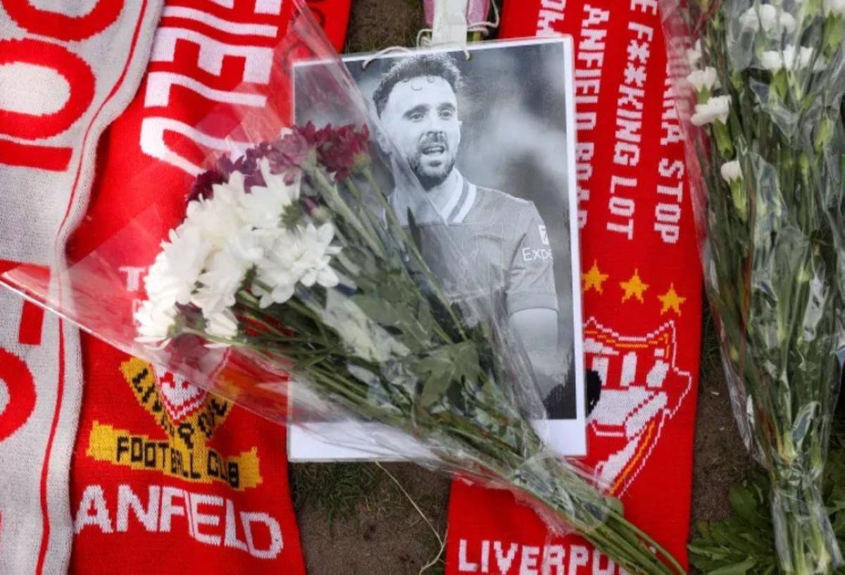 وُضعت آلاف الزهور والأوشحة واللافتات وغيرها من التذكارات خارج ملعب أنفيلد منذ وفاة جوتا وشقيقه أندريه سيلفا.