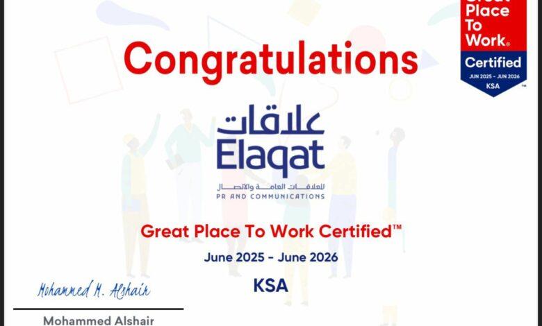 في إنجاز يُجسد التوازن بين الريادة المؤسسية والبيئة الإنسانية، حصلت شركة“علاقات” للعلاقات العامة والاتصال على شهادة Great Place to Work®️ لعام 2025، التي تُمنح لأفضل بيئات العمل حول العالم؛ وذلك عقب تقييم مستقل دقيق شمل مستويات الرضا الوظيفي، والثقافة المؤسسية، وممارسات القيادة، وقيم الشفافية والتمكين الداخلي.