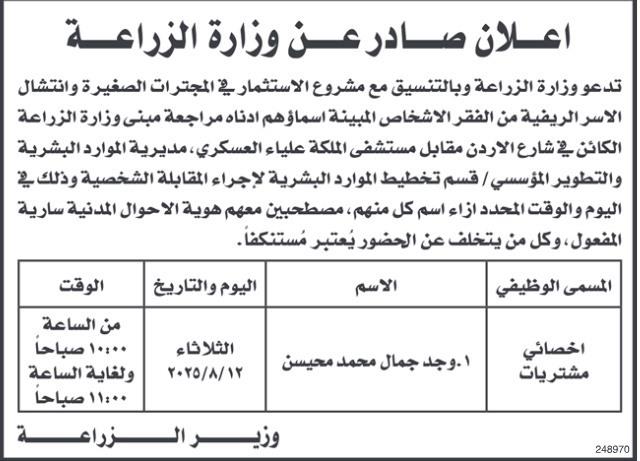 كما دعت وزارة الزراعة المبينة أسماؤهم لاجراء المقابلة الشخصية.