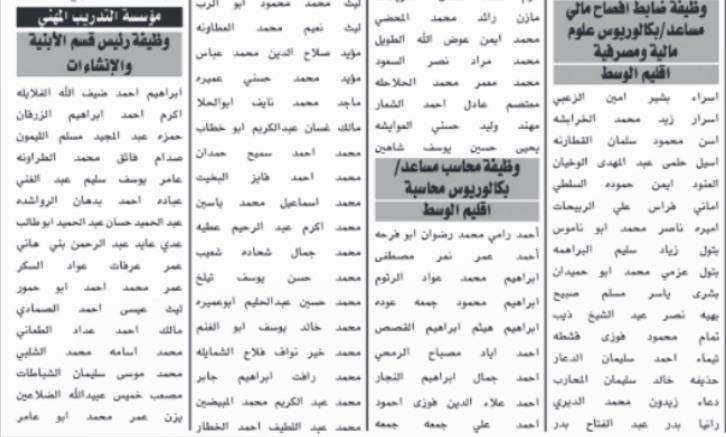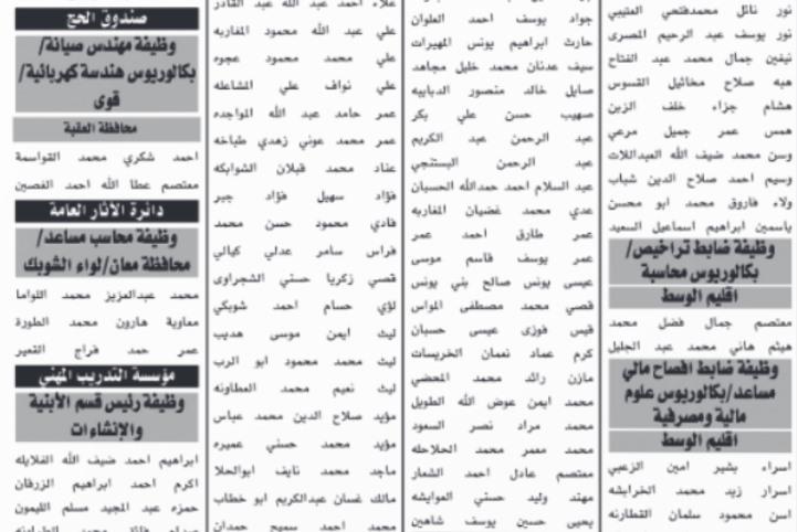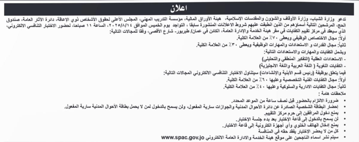 (MENAFN- Al Wakeel News) الوكيل الإخباري-تدعو وزارة الشباب، ووزارة الأوقاف والشؤون والمقدسات الإسلامية، وهيئة الأوراق المالية، ومؤسسة التدريب المهني، والمجلس الأعلى لحقوق الأشخاص ذوي الإعاقة، ودائرة الآثار العامة، وصندوق الحج، المذكورة أسماؤهم أدناه، لحضور الاختبار التنافسي.