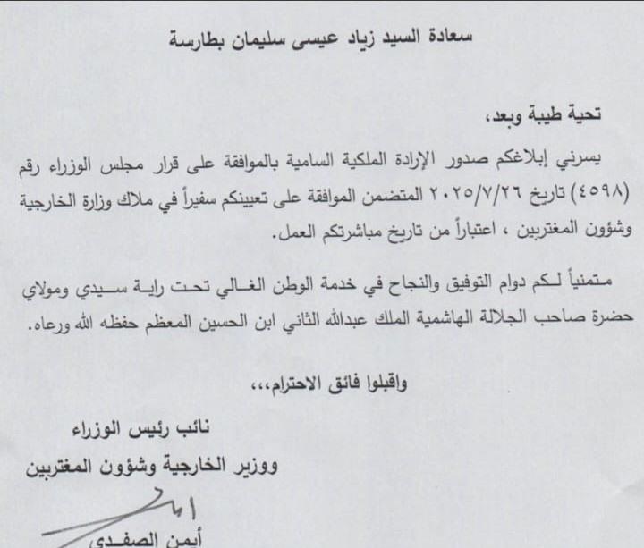 صدرت الإرادة الملكية السامية، بالموافقة على قرار مجلس الوزراء المتضمن تعيين اللواء المتقاعد السفير زياد عيسى بطارسة سفيرًا في ملاك وزارة الخارجية وشؤون المغتربين.