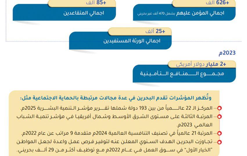 وأفاد التقرير بأن عدد المؤمن عليهم في البحرين بلغ في يونيو 2025 أكثر من 626 ألفًا، منهم 470 ألفًا من غير البحرينيين، فيما تجاوز عدد المتقاعدين 85 ألفًا، ووصل عدد الورثة المستفيدين إلى أكثر من 25 ألفًا. كما سلط الضوء على اهتمام البحرين بفئة كبار السن عبر منظومة متكاملة من القوانين والسياسات التي تضمن لهم جودة حياة كريمة ومشاركة فاعلة في المجتمع، انسجامًا مع أهداف رؤية البحرين الاقتصادية.