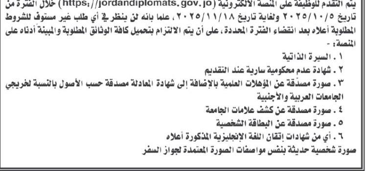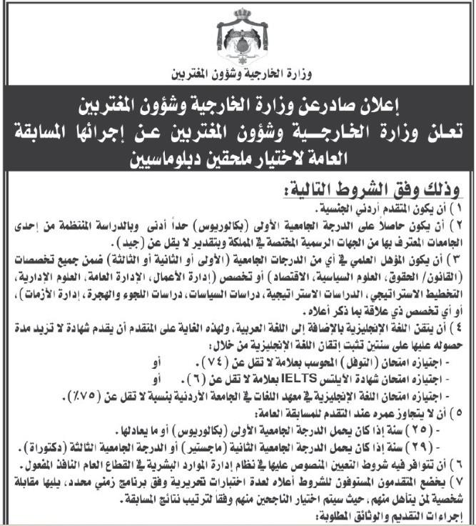 اعلنت وزارة الخارجية وشؤون المغتربين اليوم الاحد عن إجرائها المسابقة العامة لاختيار ملحقين دبلوماسيين