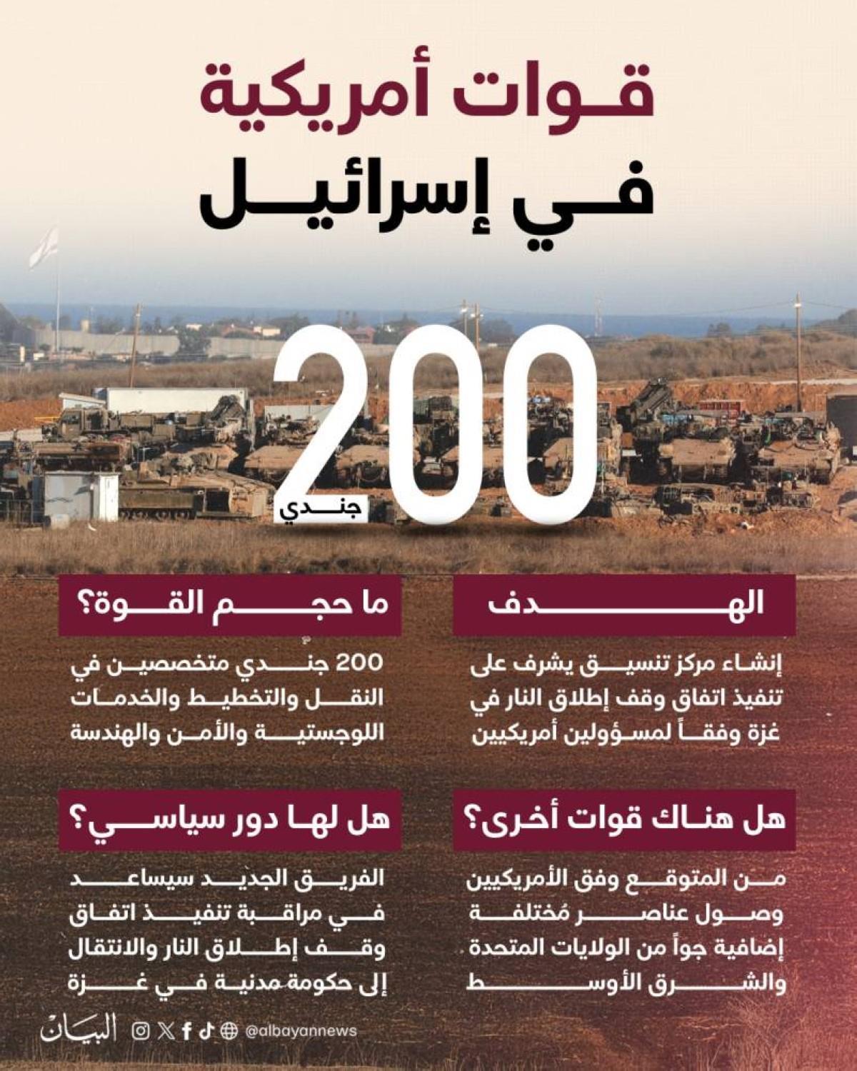 ووفقا للمسؤولين الأمريكيين، اللذين لم يتم الكشف عن هويتهما، فإن القوات التي أرسلت إلى إسرائيل، والبالغ قوامها 200 جندي، متخصصة في النقل والتخطيط والخدمات اللوجستية والأمن والهندسة. وستعمل هذه القوات مع ممثلين من الدول الشريكة الأخرى والقطاع الخاص والمنظمات غير الحكومية.