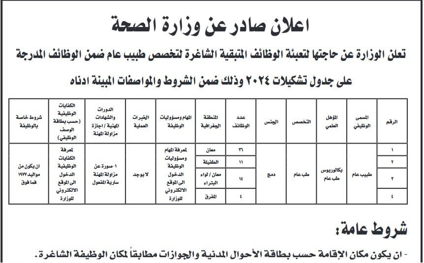 (MENAFN- Al Wakeel News) الوكيل الإخباري- اعلنت وزارة الصحة اليوم الاحد، عن حاجتها لتعبئة الوظائف المتبقية لتخصص طبيب.